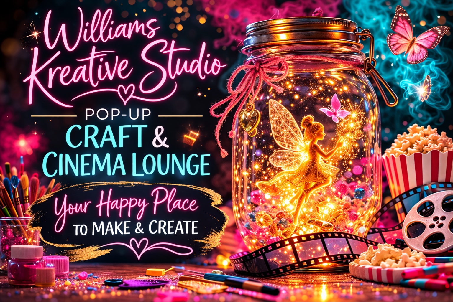 Williams Kreative Studio is a vibrant pop-up creative experience where families, friends, and individuals come together to relax, creae beautiful crafts, and enjoy uplifting classic movie nights.